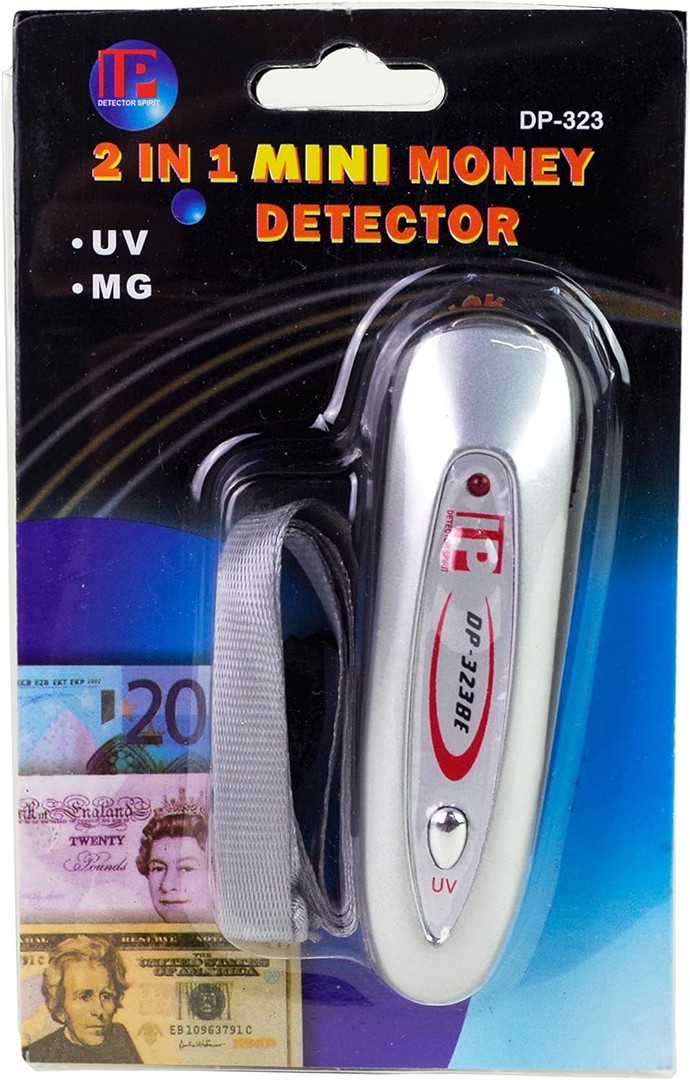 Este 2 en 1 mini detector de dinero utiliza la luz UV para detectar fluorescente patrones en papel moneda. La brillante luz ultravioleta revela Hidden marcas de agua en billetes de banco para asegurar la autenticidad. El botón de mg permite ir a más de la tira magnética se encuentra en papel dinero y un "beep Will Go apagado cuando la tira magnética es reconocido. Esta detector de dinero también viene con una correa de mano para un fácil manejo y es lo suficientemente portátil para llevar a cualquier parte con usted.