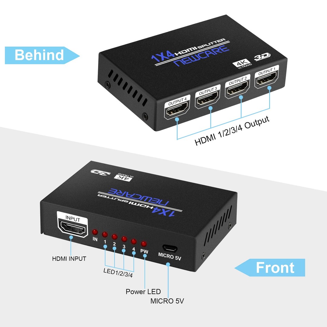 Puede distribuir la señal de entrada desde dispositivos fuente HD (como, STB, PC, DVD, HD-DVD, para PS3, etc.) a cuatro señales de salida idénticas simultáneamente, se pueden crear más salidas conectando en cascada múltiples divisores. y es compatible con el formato 3D completo y la resolución máxima de hasta 1080p.