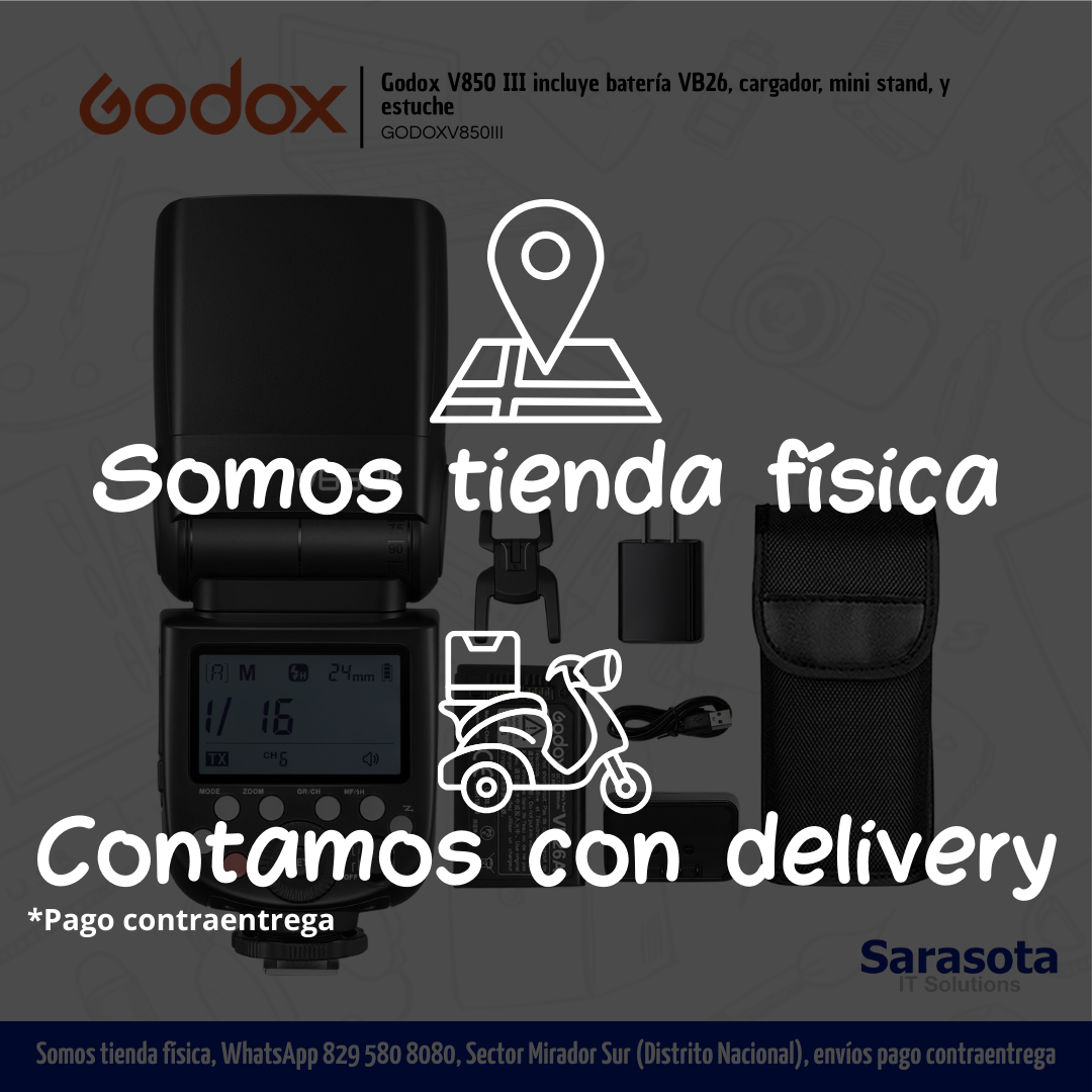Godox V850 III incluye batería VB26, cargador, mini stand, gelatinas y estuche