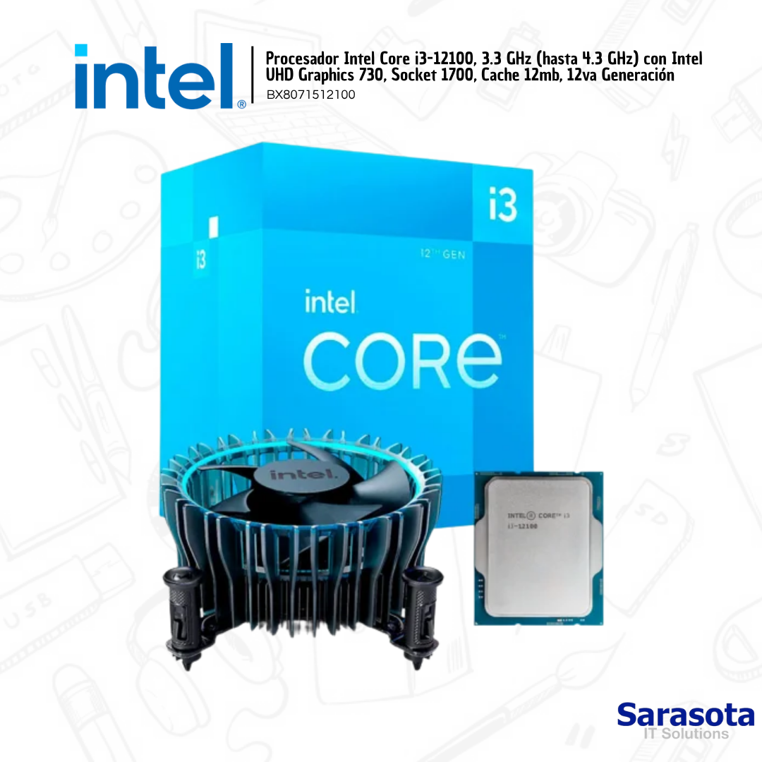 Procesador Intel Core i3-12100, 3.3 GHz (hasta 4.3 GHz) con Intel UHD Graphics 730, Socket 1700, Cache 12mb, 12va Generación BX8071512100