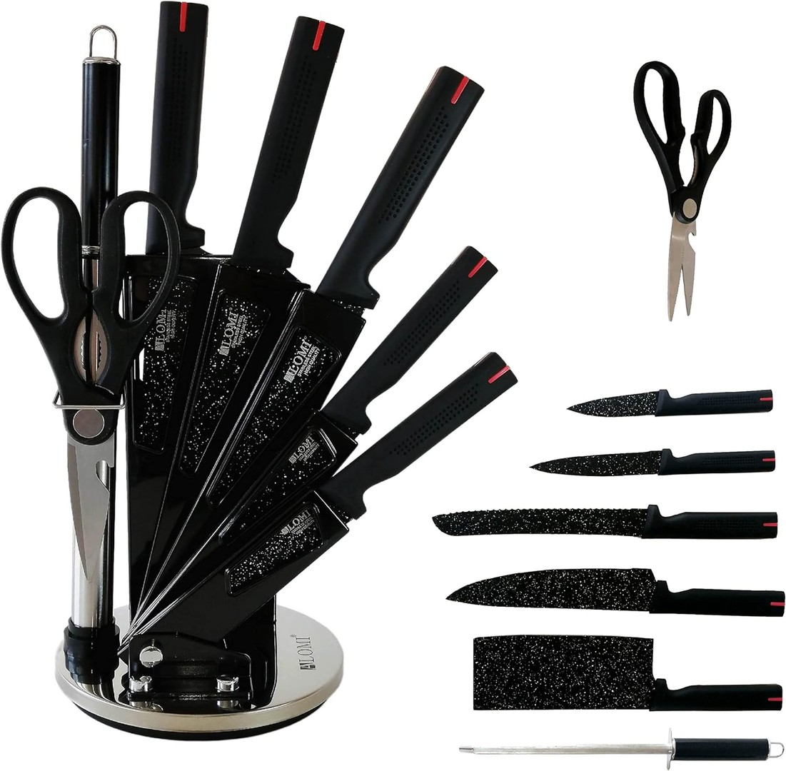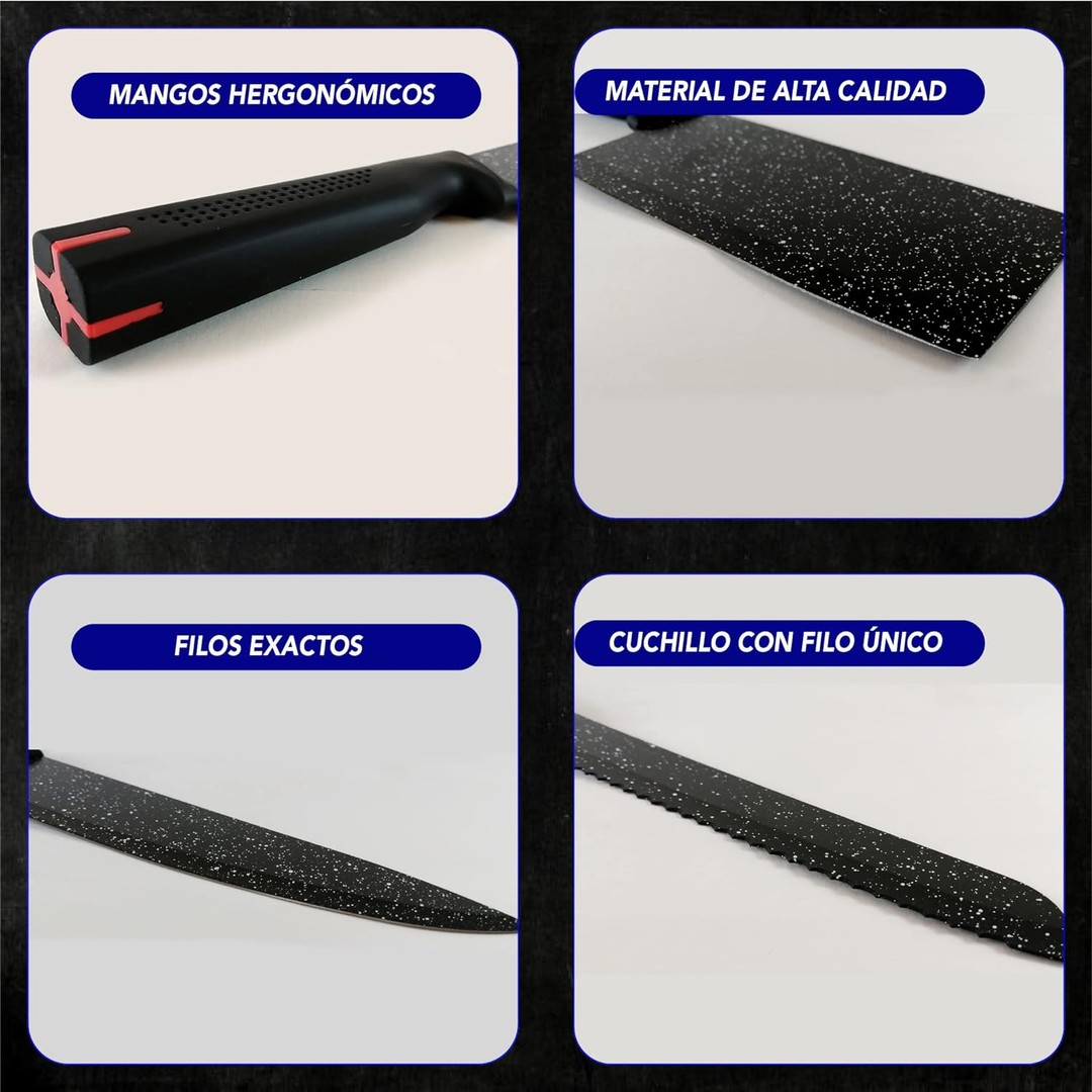 JUEGO COMPLETO TODO EN UNO: un juego de cuchillos de cocina profesional que satisface todas tus necesidades. Incluye 5 cuchillos profesionales, 1 tijeras, 1 afilador de alta calidad y 1 moderno soporte para cuchillos de calidad.