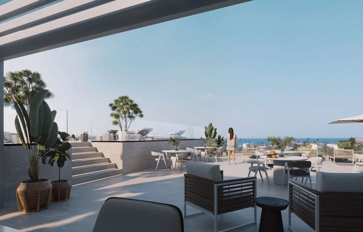 * Terraza en la azotea con piscina infinity y área de bar